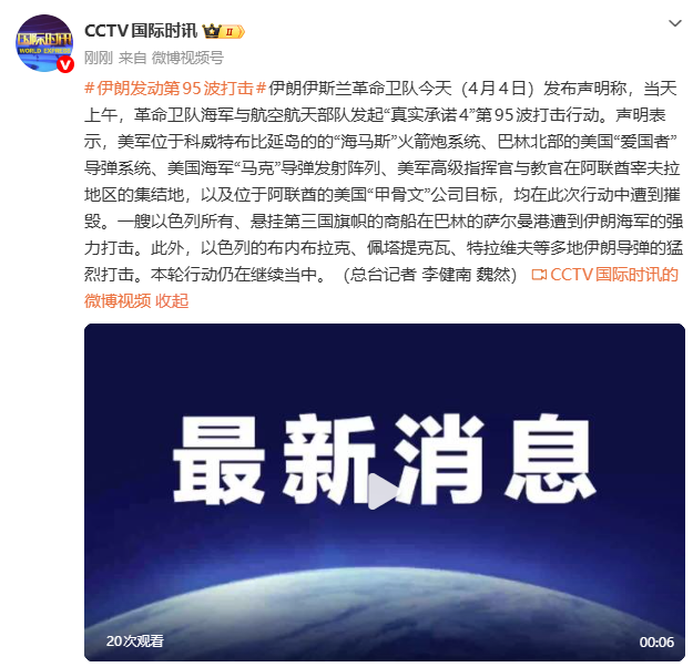 伊朗伊斯兰革命卫队今天(4月4日)发布声明称,当天上午,革命卫队海军与航空航天部队发起“真实承诺4”第95波打击行动。
