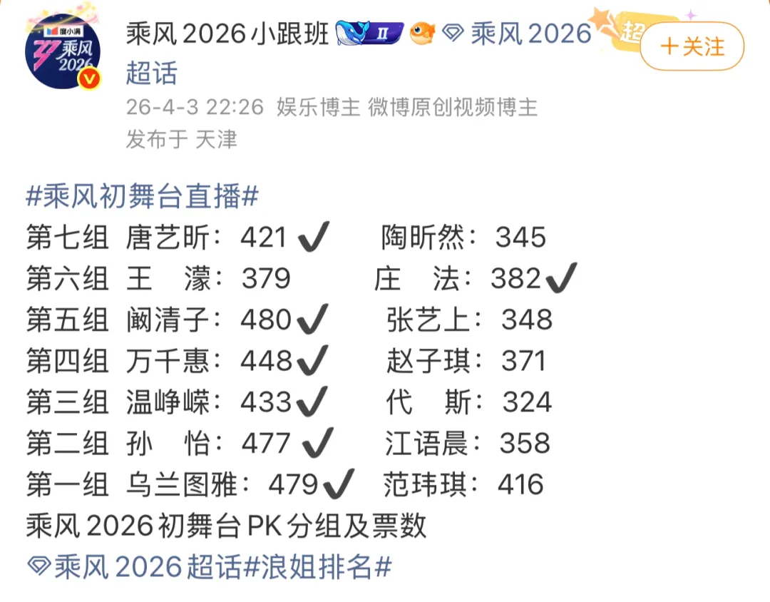 4月3日晚,《乘风2026》综艺初舞台全开麦直播首日,乌兰图雅、范玮琪、孙怡、江语晨、温峥嵘、万千惠、赵子琪、阚清子、张艺上、王濛、庄法、唐艺昕、陶昕然、黄灿灿、代斯、何宣林等晋级下一场公演。