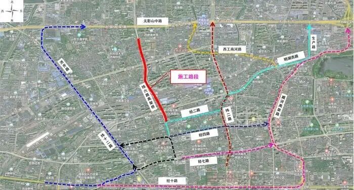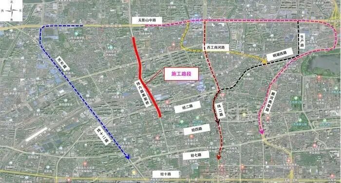 第三阶段(9月11日—10月30日):夜间22:30至次日6:00封闭机动车道、非机动车道施工(堤口路至经二路段),机动车需绕行周边道路,非机动车借用人行道通行。