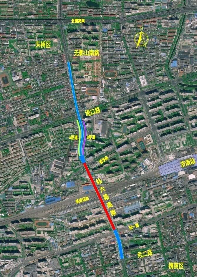 纬六路高架桥位于济南站西侧,南起经二路,北至无影山南路,横跨天桥、槐荫两区,是济南市城市快速路网的重要组成部分,也是南北向交通的关键通道。此次大修将重点对主桥、引桥、匝道上下部结构及附属设施进行维修改造,全长约2.7公里。
