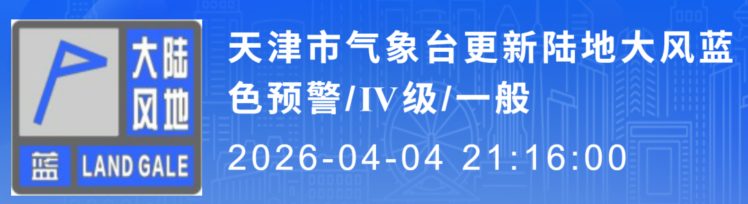 天津市气象台于2026年04月04日21时16分继续发布陆地大风蓝色预警信号:目前天津地区风力已经减弱,今天夜间大风天气短暂停歇,但明天白天风力将再次增大。预计明天白天我市将有西北风5-6级阵风7-8级,北部山区个别点阵风9级,并伴有局地扬沙天气;明天前半夜风力减弱至4-5级阵风6-7级,请有关单位和人员做好防范准备。