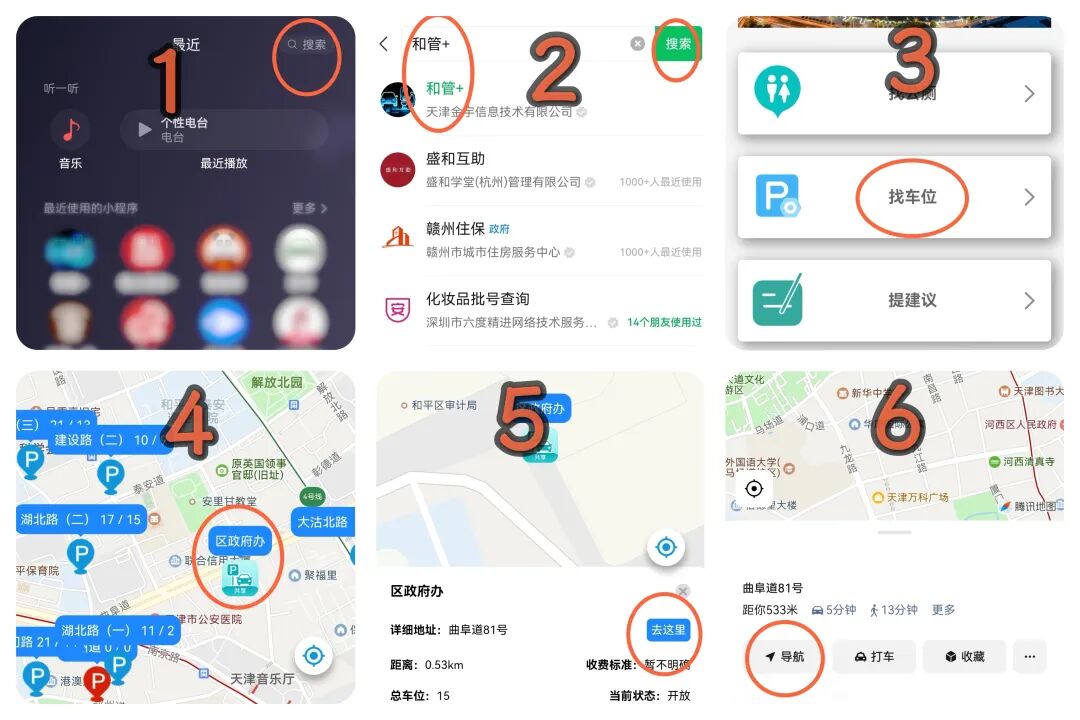 市民游客可通过“和管+”微信小程序,选择“找车位”功能实时查询周边停车场位置及空余车位信息,一键导航直达停车点位。具体操作步骤如下: