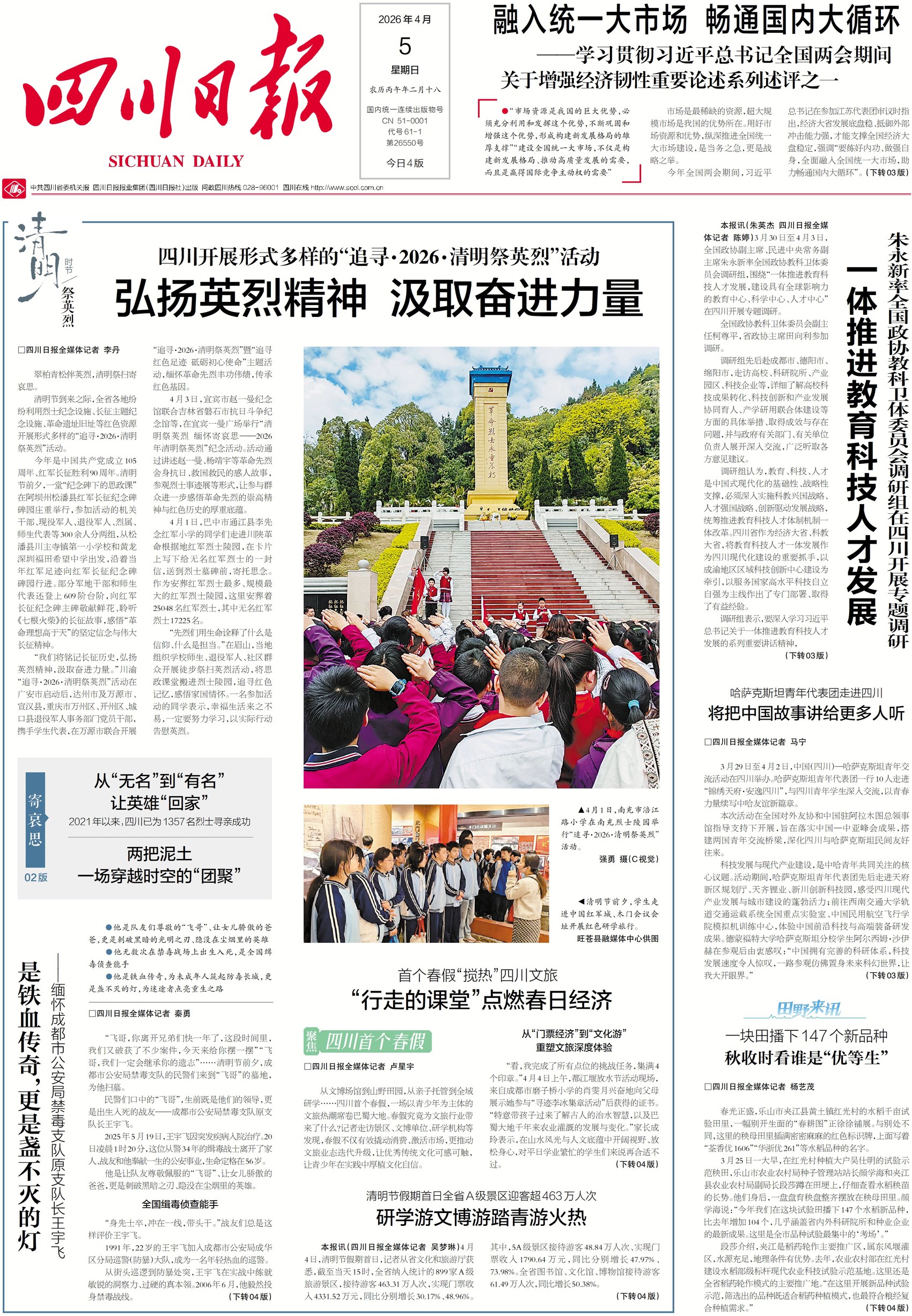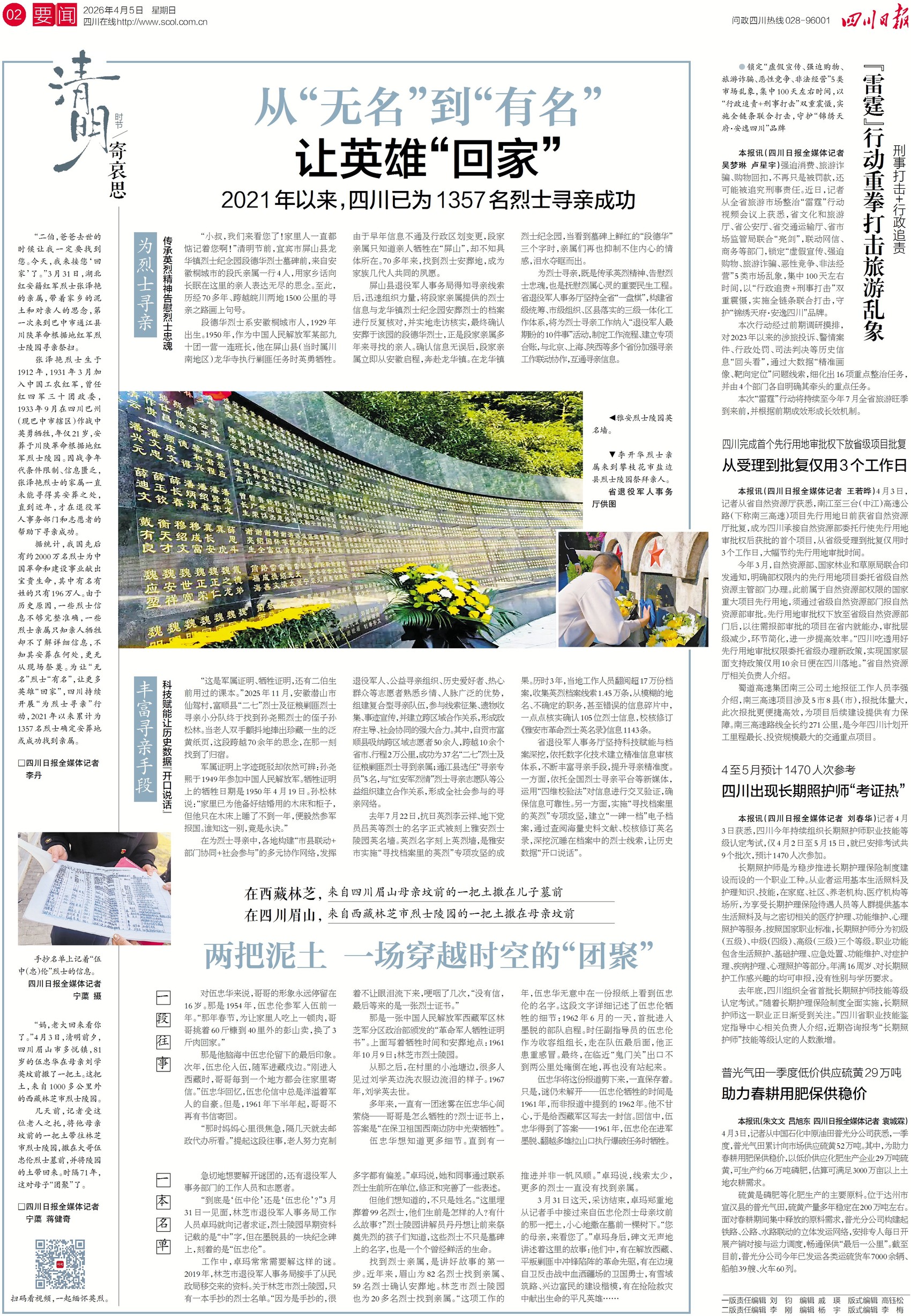 今天是清明节。在清明节到来之际,四川各地纷纷利用烈士纪念设施、长征主题纪念设施、革命遗址旧址等开展形式多样的“追寻·2026·清明祭英烈”活动,弘扬英烈精神。为告慰烈士忠魂,四川持续开展“为烈士寻亲”行动,2021年以来累计为1357名烈士确定安葬地或成功找到亲属。今天,让我们与一版、二版一起,怀着崇敬之心,深情缅怀英烈。