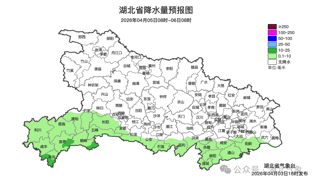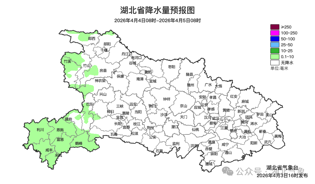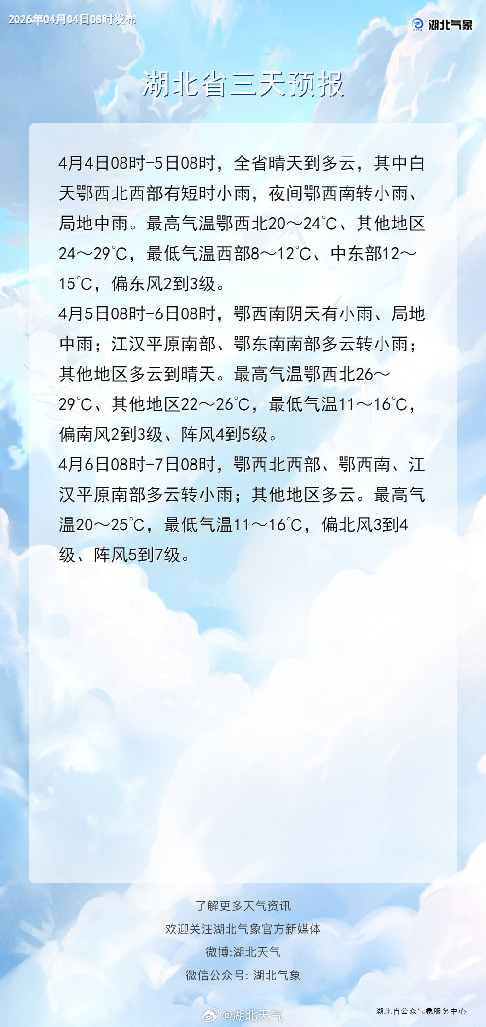 4月4日08时-4月5日08时,鄂西北西部、鄂西南多云有分散性阵雨;其他地区晴天到多云。最高气温22~28℃,最低气温西部8~12℃、中东部12~15℃,偏东风2到3级。