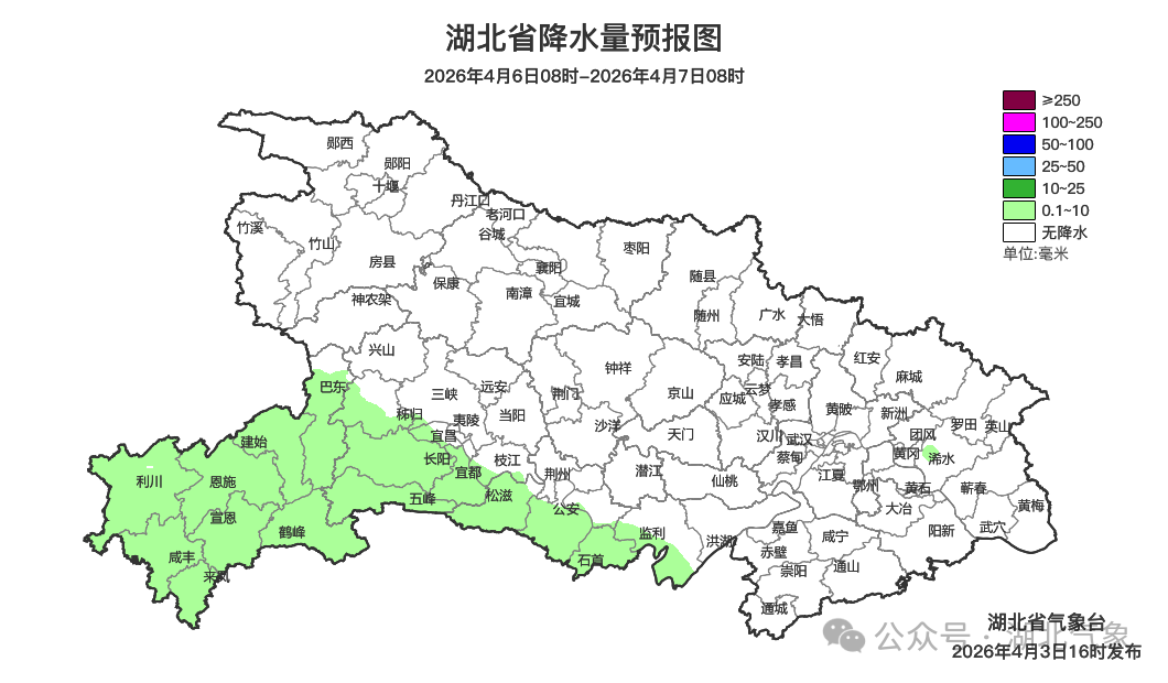 4月6日08时-4月7日08时,鄂西南、江汉平原南部多云转小雨;其他地区多云。最高气温20~25℃,最低气温11~16℃,偏北风3到4级、阵风5到7级。