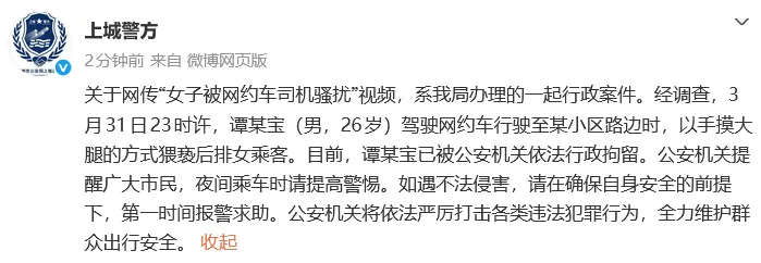 关于网传“女子被网约车司机骚扰”视频,系我局办理的一起行政案件。经调查,3月31日23时许,谭某宝(男,26岁)驾驶网约车行驶至某小区路边时,以手摸大腿的方式猥亵后排女乘客。目前,谭某宝已被公安机关依法行政拘留。公安机关提醒广大市民,夜间乘车时请提高警惕。如遇不法侵害,请在确保自身安全的前提下,第一时间报警求助。公安机关将依法严厉打击各类违法犯罪行为,全力维护群众出行安全。