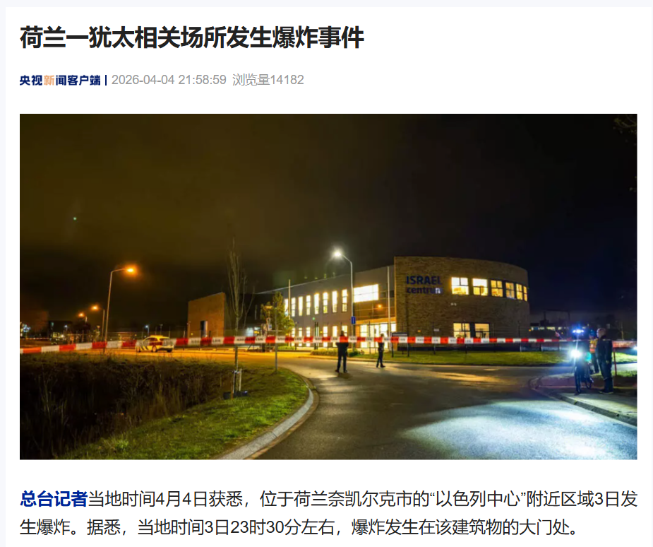 总台记者当地时间4月4日获悉,位于荷兰奈凯尔克市的“以色列中心”附近区域3日发生爆炸。据悉,当地时间3日23时30分左右,爆炸发生在该建筑物的大门处。
