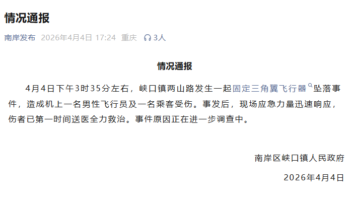 重庆“南岸发布”通报称,4月4日下午3时35分左右,峡口镇两山路发生一起固定三角翼飞行器坠落事件,造成机上一名男性飞行员及一名乘客受伤。事发后,现场应急力量迅速响应,伤者已第一时间送医全力救治。事件原因正在进一步调查中。
