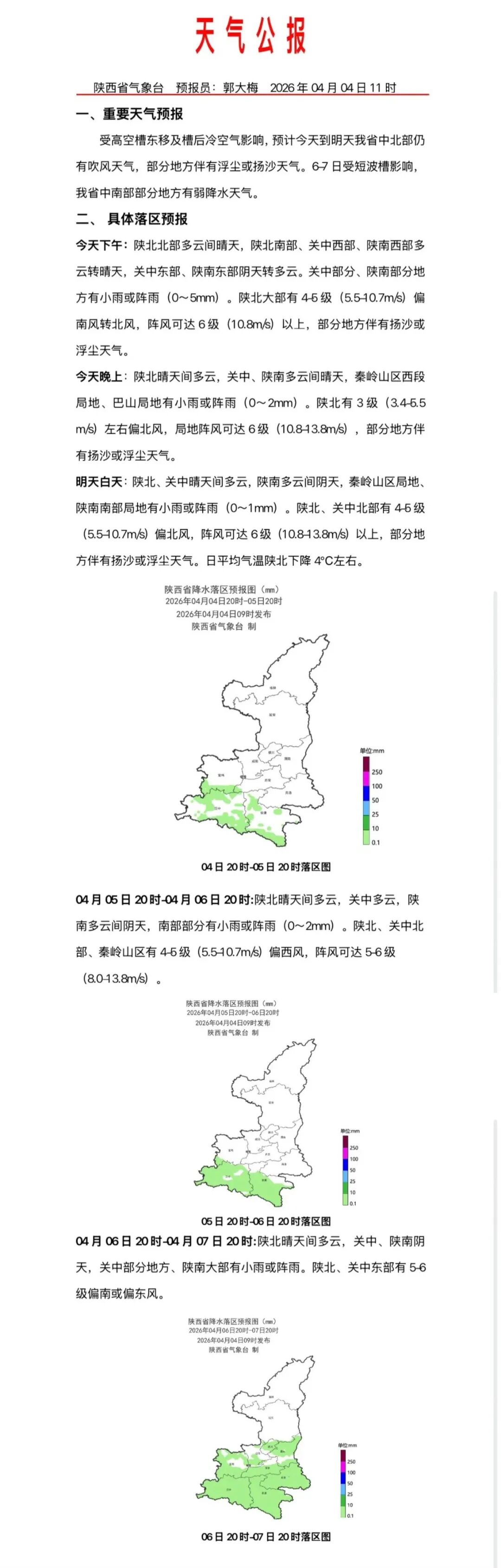 受高空槽东移及槽后冷空气影响,预计今天到明天陕西省中北部仍有吹风天气,部分地方伴有浮尘或扬沙天气。6—7日受短波槽影响,陕西省中南部部分地方有弱降水天气。