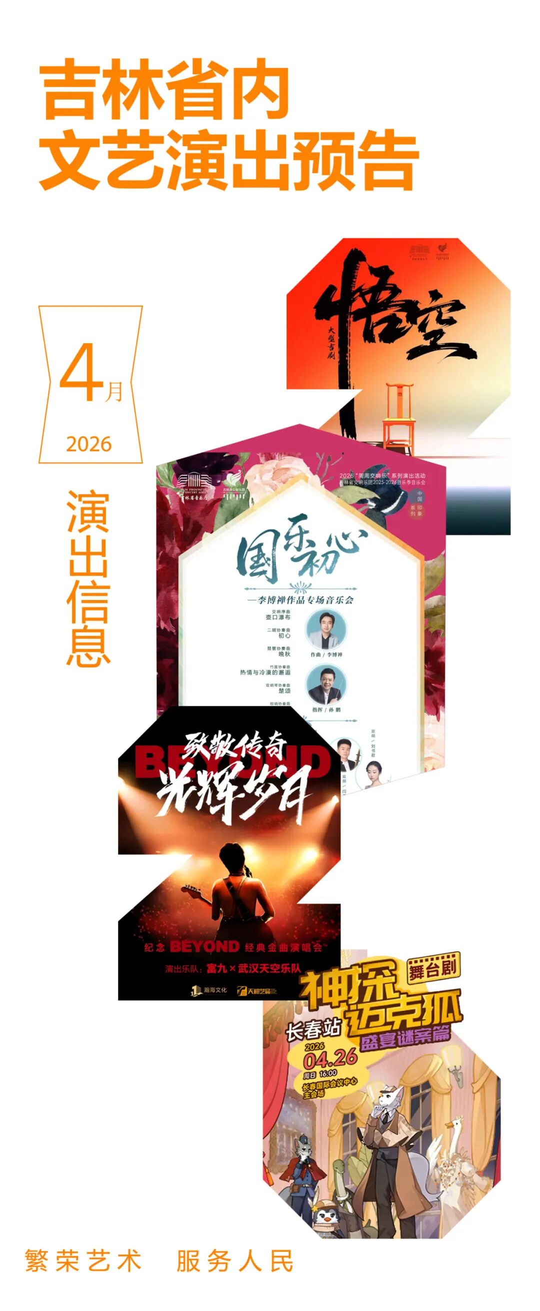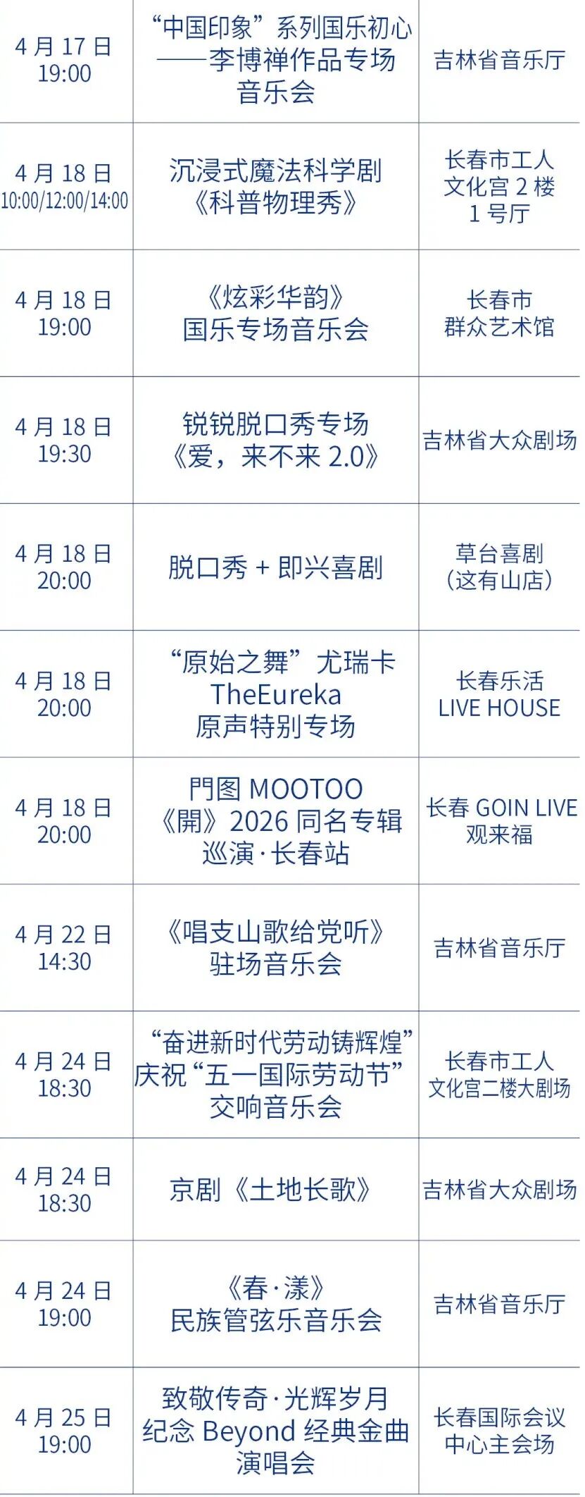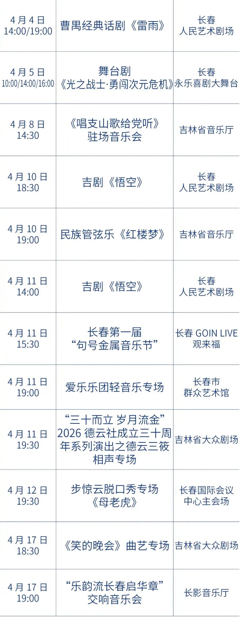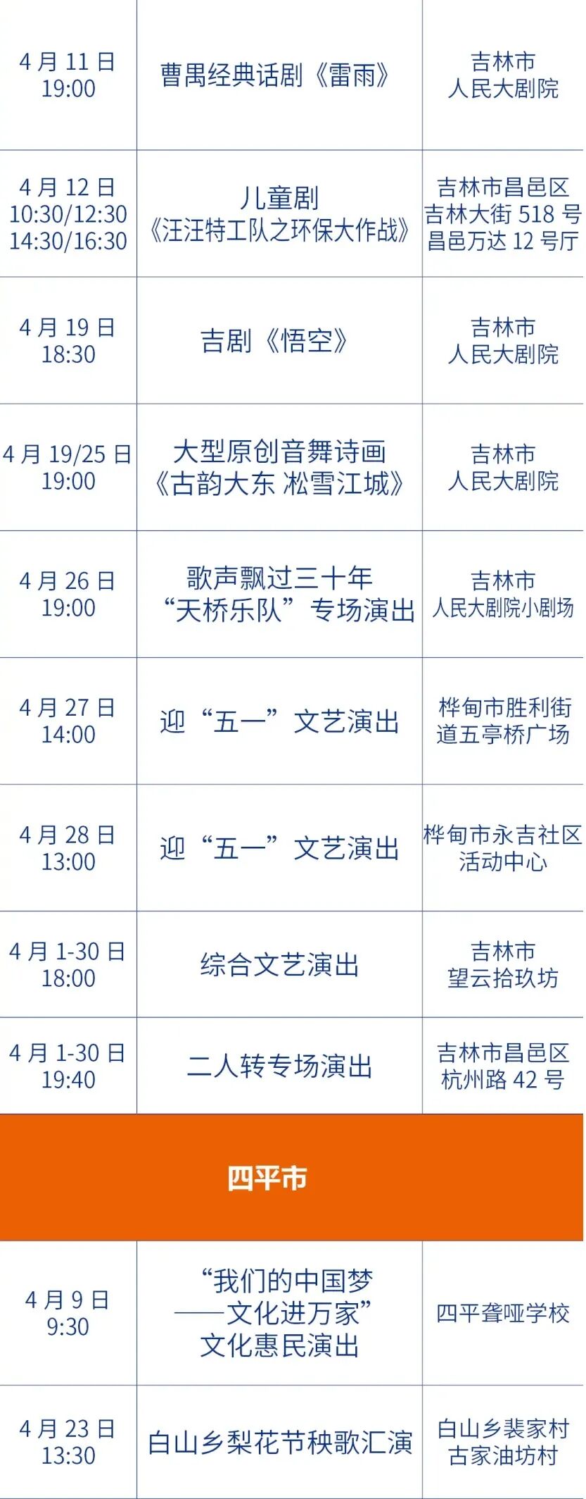 春日文艺福利来袭!今年4月,吉林省各地演出排期全面解锁,不管是偏爱传统戏曲、国乐经典,还是沉迷摇滚现场、相声脱口秀、悬疑话剧,都能找到心仪之选。从演唱会到儿童剧,从吉剧新作到国粹经典,这场春日艺术狂欢,等你来赴约!