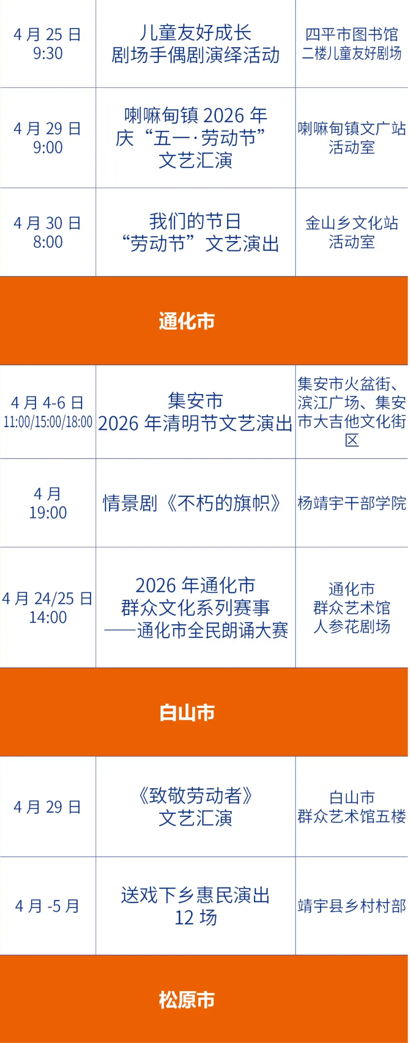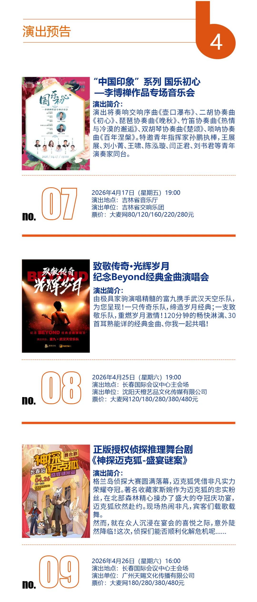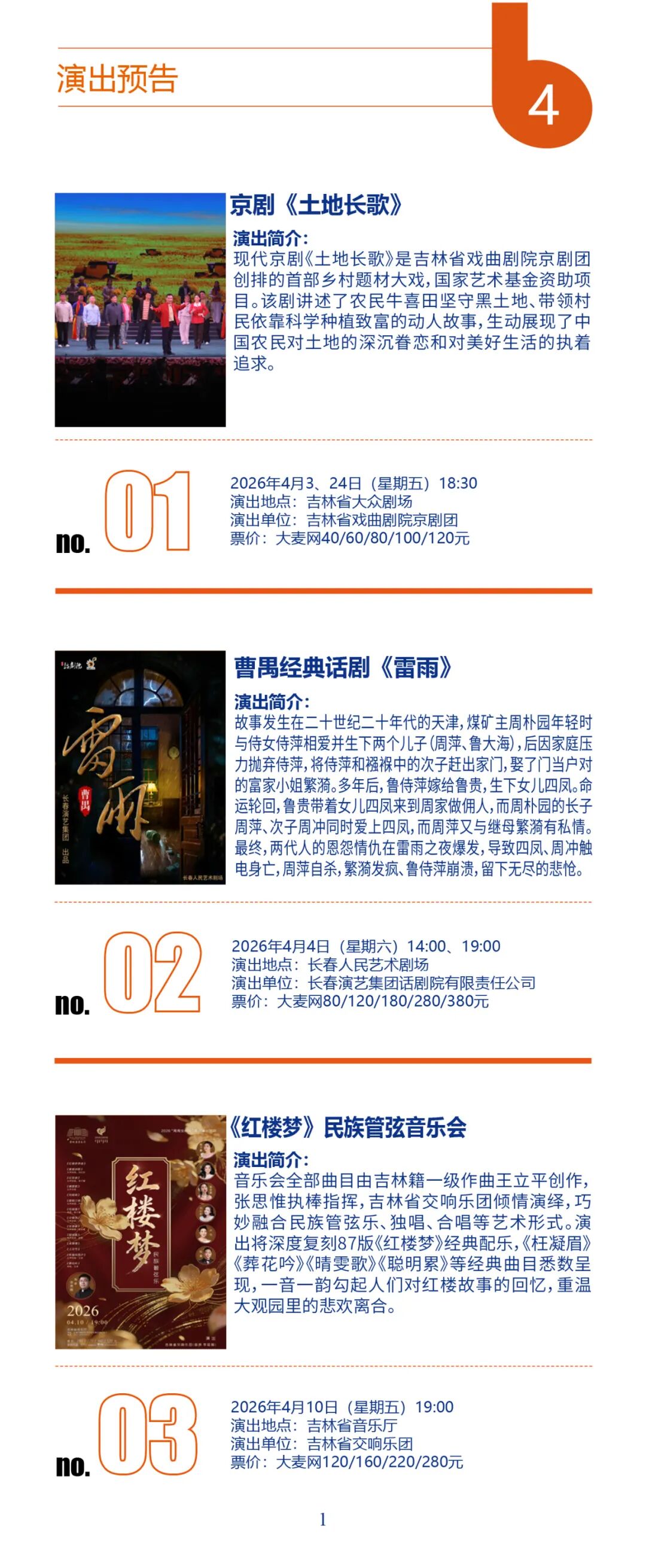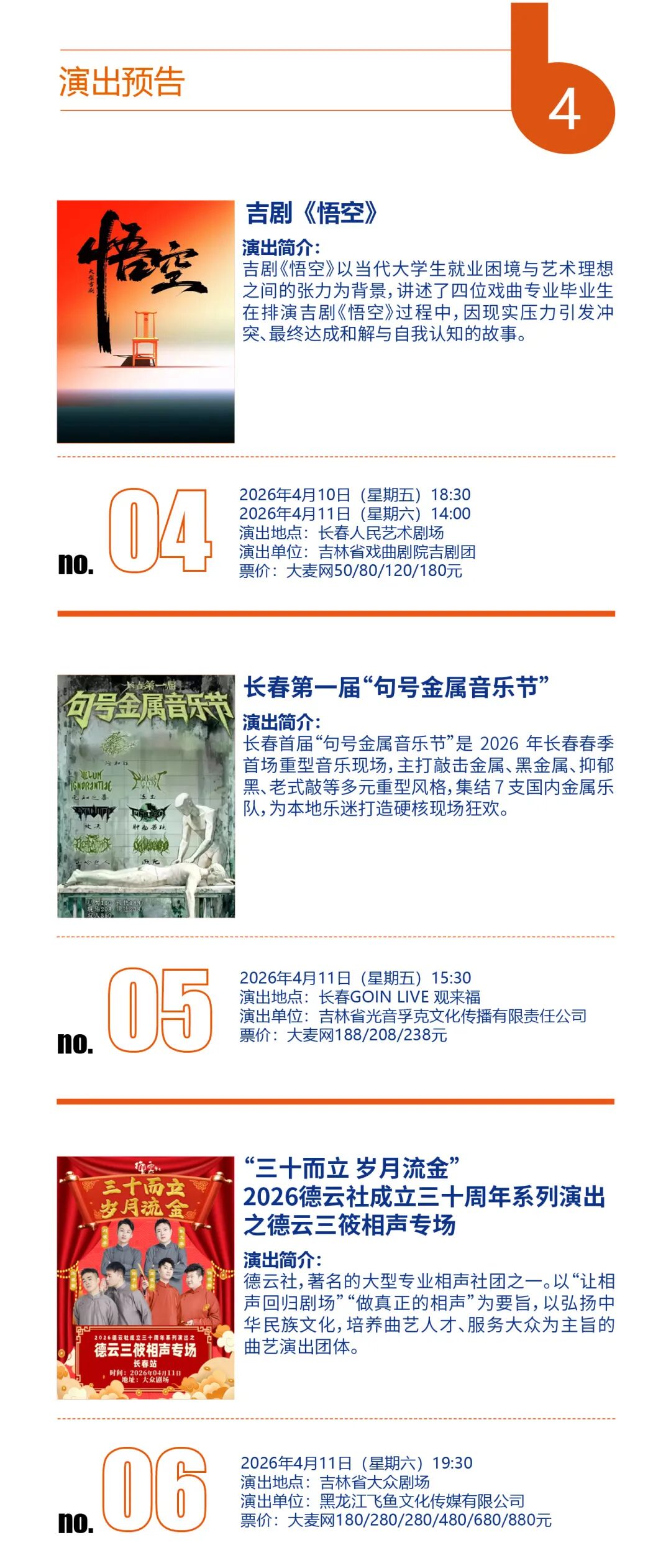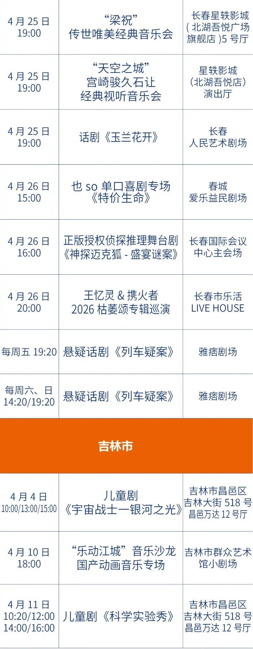 春日文艺福利来袭!今年4月,吉林省各地演出排期全面解锁,不管是偏爱传统戏曲、国乐经典,还是沉迷摇滚现场、相声脱口秀、悬疑话剧,都能找到心仪之选。从演唱会到儿童剧,从吉剧新作到国粹经典,这场春日艺术狂欢,等你来赴约!