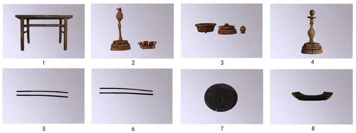 这是该墓葬出土的木质供桌及上面摆放的3个烛台、2双箸、2件盘。(大同市考古研究所供图)