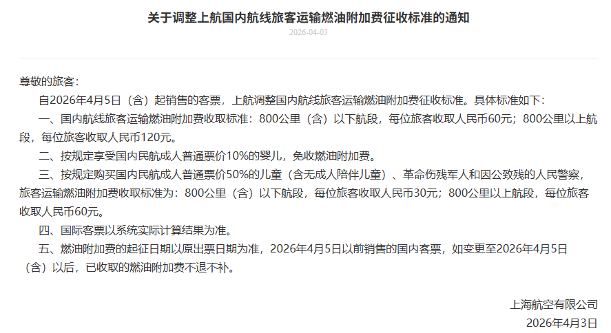 4月1日,中联航发布关于调整中国联合航空有限公司国内航线旅客运输燃油附加费收取标准的通知,表示自2026年4月5日(含)起销售的客票将调整国内航线旅客运输燃油附加费征收标准。