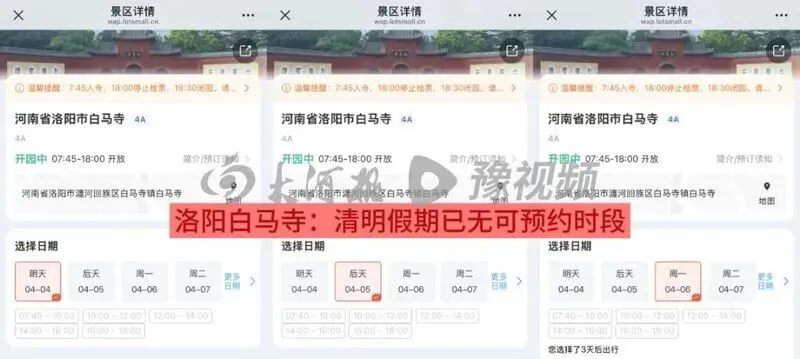 此外,洛阳博物馆4月3日至5日预约也已满额,4月6日预约尚未开启。建议计划前往的游客及时调整行程,选择其他景区错峰出游。