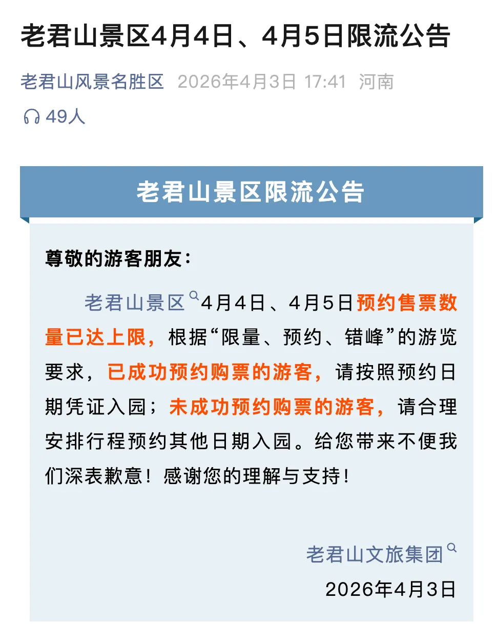 老君山景区4月4日、4月5日预约售票数量已达上限。
