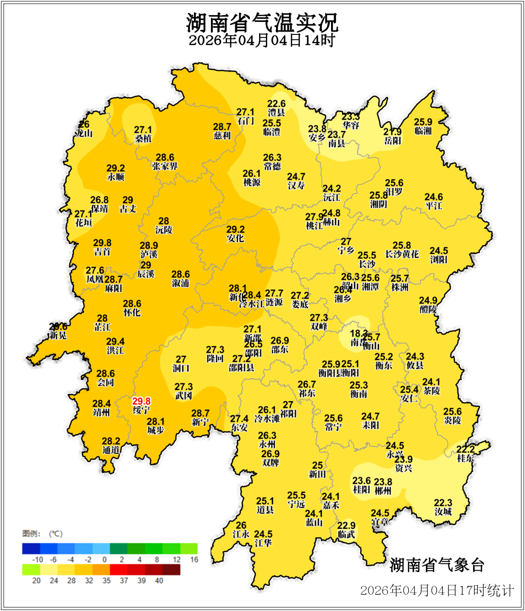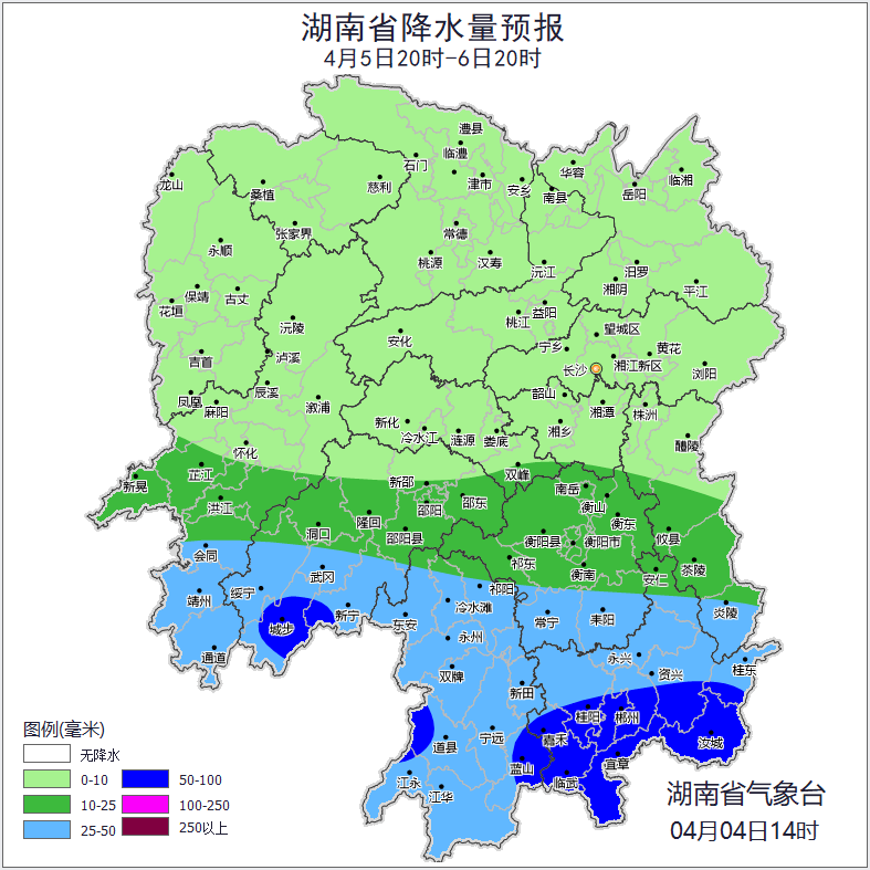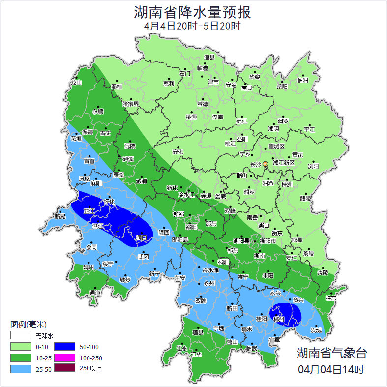5日白天,多云转小到中等阵雨或雷阵雨,其中湘西、湘南部分大雨,怀化(市区、洪江、麻阳、芷江、中方)、邵阳(洞口、绥宁、武冈)、郴州(市区、宜章、资兴)暴雨,夜间到清晨湘东局地有雾;北风2~3级;最高气温湘南25~29℃,其他地区19~24℃;最低气温12~15℃。