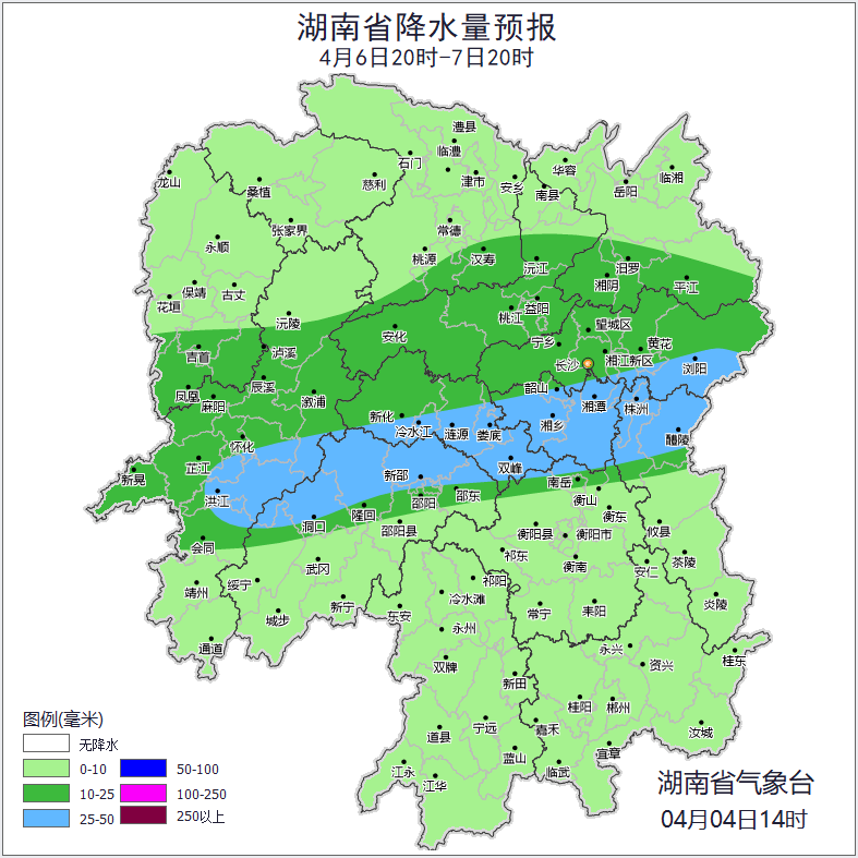 6日晚上至7日白天,全省阴天有小到中等阵雨或雷阵雨,其中湘中局地大雨;北风2~3级;最高气温19~25℃;最低气温15~19℃。