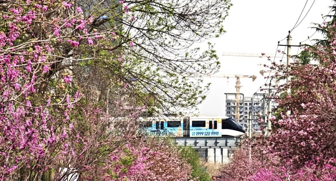 4月3日,在西安市瞪羚一路,连绵的樱花与紫荆绚烂绽放,高新云巴列车在空中驶过,现代交通与自然生态之美和谐同框,俨然一幅美丽的春日城市画卷。(西安报业全媒体记者 窦翊明 摄)