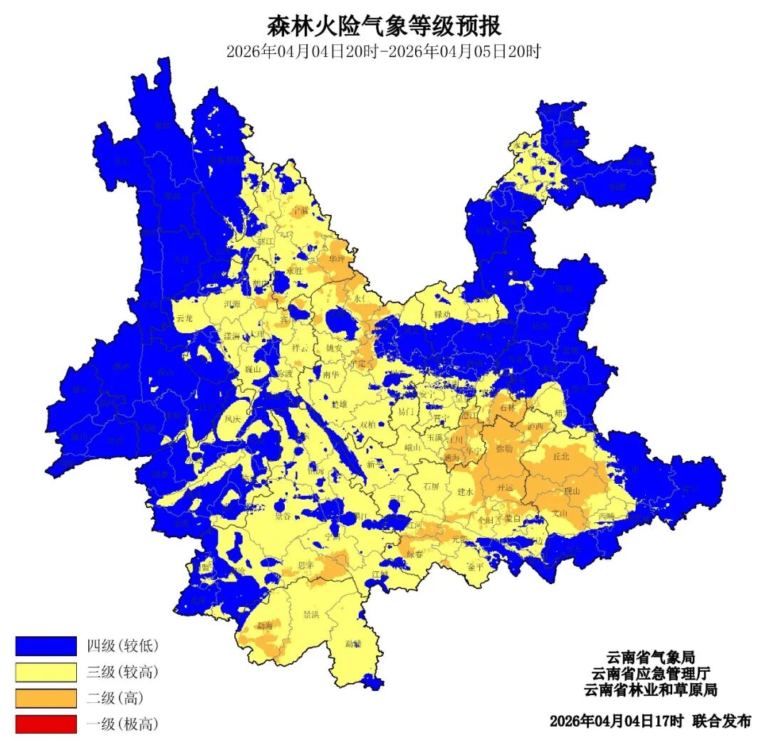 4月4日20时至4月5日20时,丽江市东南部、楚雄州北部、玉溪市东部、红河州北部、文山州西部二级(高),丽江市大部、大理州中东部、楚雄州南部、普洱市东北部、西双版纳州、昆明市南部、玉溪市中西部、红河州南部、昭通市中部三级(较高),其他地区四级(较低)。