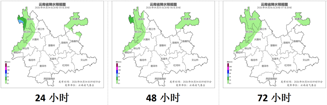 4月5日20时到4月6日20时:迪庆州西部、怒江州、丽江市西部、大理州西部、保山市北部、德宏州北部、昭通市多云间阴有阵雨局部中雨,其他地区晴间多云。