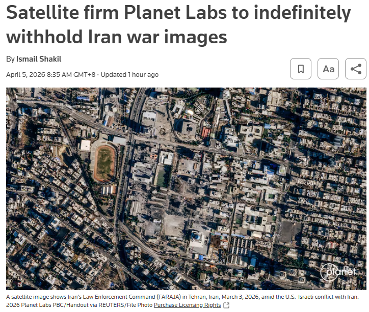 总部位于美国旧金山的一家遥感卫星数据公司——(Planet Labs)4月4日宣布,应美国政府要求,将无限期暂停发布伊朗及中东冲突地区的卫星影像。