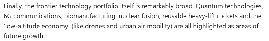 文章还注意到,当前,中国继续要求在科学技术等多个领域取得突破。这意味着,中国需要在整个技术体系层面构建抗压能力,而非依赖个别领域的孤立进展。此外,规划纲要所涵盖的前沿技术领域极为广泛。量子技术、第六代移动通信技术、生物制造、核聚变、可复用重型运载火箭以及“低空经济”(包括无人机与城市空中交通)等,均被明确为未来发展的重点方向。