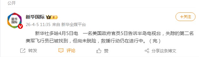 一名美国政府官员5日告诉半岛电视台,失踪的第二名美军飞行员已被找到,但尚未脱险,救援行动仍在进行中。
