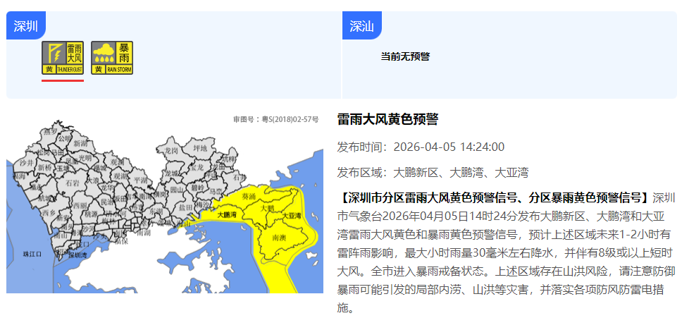 【深圳市分区雷雨大风黄色预警信号、分区暴雨黄色预警信号】深圳市气象台2026年04月05日14时24分发布大鹏新区、大鹏湾和大亚湾雷雨大风黄色和暴雨黄色预警信号,预计上述区域未来1-2小时有雷阵雨影响,最大小时雨量30毫米左右降水,并伴有8级或以上短时大风。全市进入暴雨戒备状态。上述区域存在山洪风险,请注意防御暴雨可能引发的局部内涝、山洪等灾害,并落实各项防风防雷电措施。