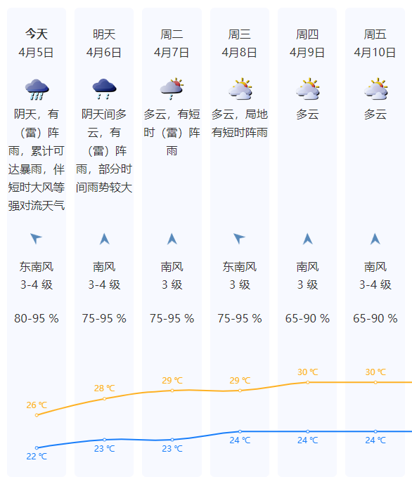 今天上午阴天为主,中午至傍晚有雷阵雨,累计可达暴雨,伴6-8级短时大风等强对流天气;白天气温在23-26℃;清明假期期间,天气不稳定,强对流和暴雨风险高,将出现多轮雷雨天气过程。