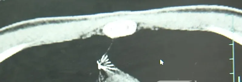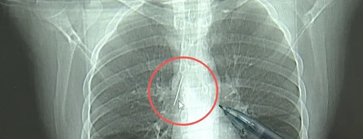 杭州市第一人民医院心胸外科副主任 冯兴:“我们看到这个针的尖锐部,正好指向他体内的一个大血管,边上是上腔静脉和胸主动脉,因此这个针稍有不慎,就有可能造成周边血管的损伤,甚至危及生命。”
