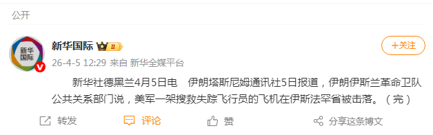 伊朗塔斯尼姆通讯社5日报道,伊朗伊斯兰革命卫队公共关系部门说,美军一架搜救失踪飞行员的飞机在伊斯法罕省被击落。