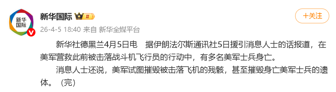 据伊朗法尔斯通讯社5日援引消息人士的话报道,在美军营救此前被击落战斗机飞行员的行动中,有多名美军士兵身亡。