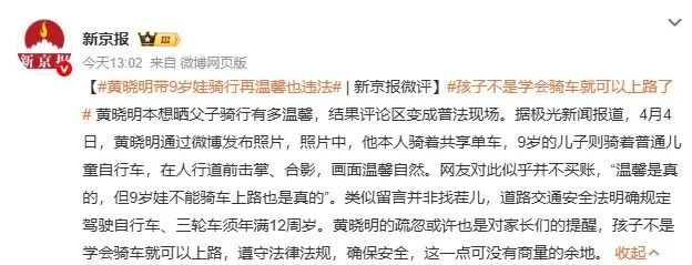 黄晓明本想晒父子骑行有多温馨,结果评论区变成普法现场。4月5日,#黄晓明带9岁娃骑行再温馨也违法#冲上微博热搜。
