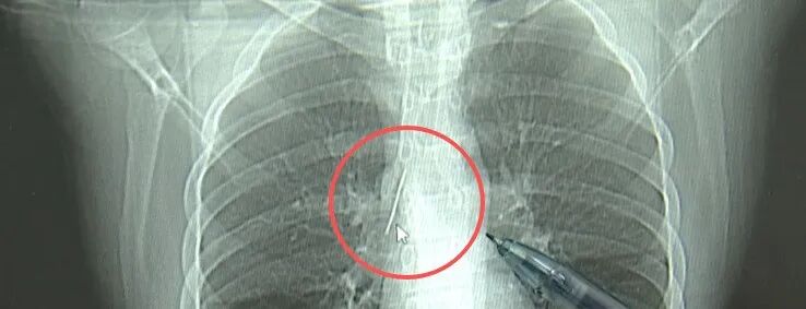 冯兴表示:“我们看到这个针的尖锐部,正好指向他体内的一个大血管,边上是上腔静脉和胸主动脉,因此这个针稍有不慎,就有可能造成周边血管的损伤,甚至危及生命。”