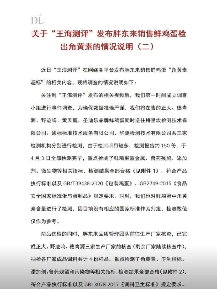 4月5日,胖东来官方账号发布关于“王海测评”称胖东来销售鲜鸡蛋检出角黄素的情况说明(二)。