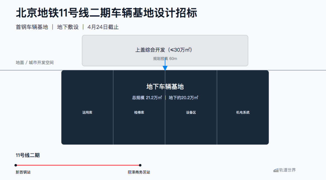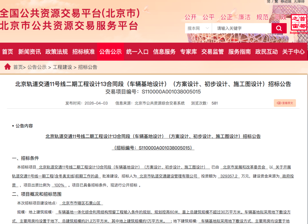 4月3日,北京轨道交通11号线二期工程设计13合同段(车辆基地设计)招标公告发布,投标截止时间为4月24日。