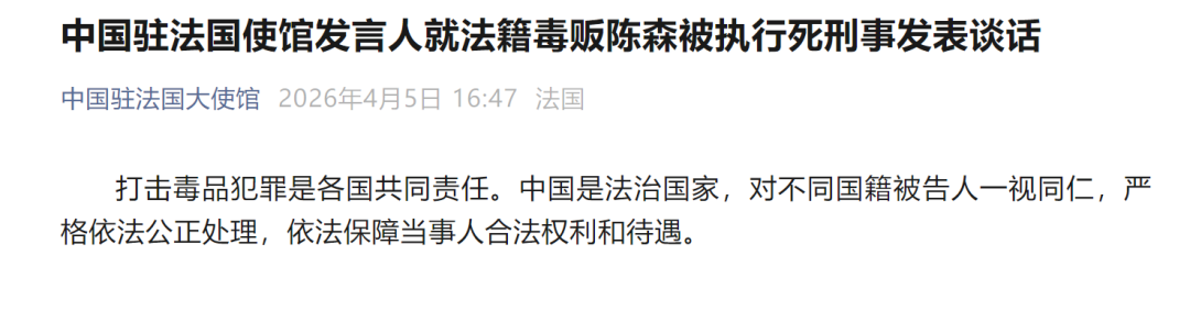 4月5日,中国驻法国使馆发言人就法籍毒贩陈森被执行死刑事发表谈话。打击毒品犯罪是各国共同责任。中国是法治国家,对不同国籍被告人一视同仁,严格依法公正处理,依法保障当事人合法权利和待遇。