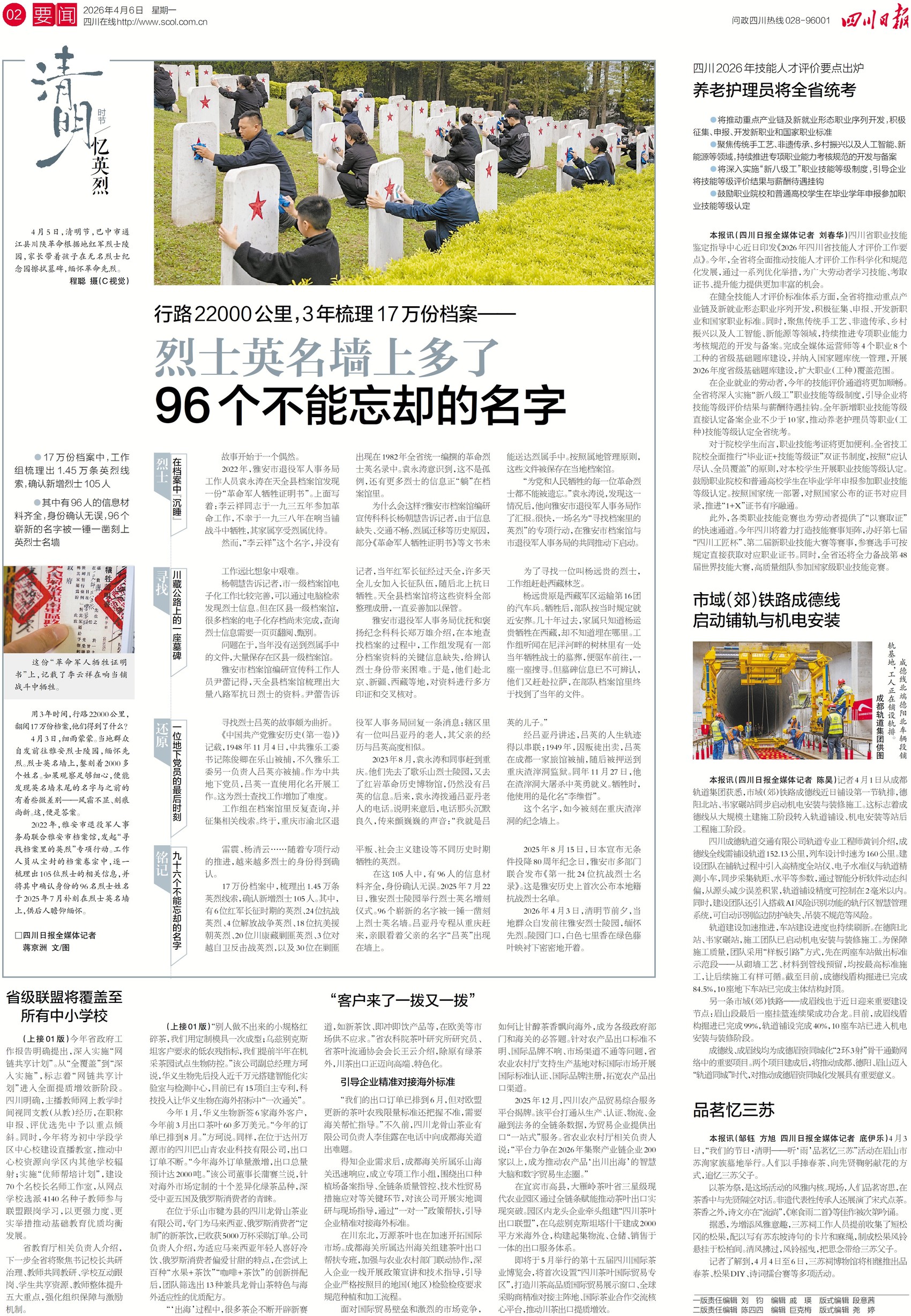 在雅安烈士陵园的烈士英名墙上,錾刻着2000多个姓名。如果你观察足够细心,就能发现英名墙末尾的名字与之前的有着些微差别。2022年,雅安市退役军人事务局和雅安市档案馆发起“寻找档案里的英烈”专项行动,从尘封的档案卷宗中梳理出105位烈士的信息,并将其中确认身份的96名烈士姓名于2025年7月补刻在烈士英名墙上。这个故事是如何开始的?