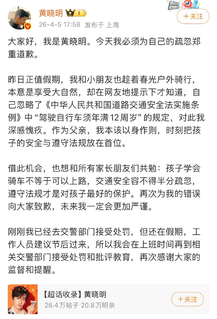4月5日,演员黄晓明发文道歉。