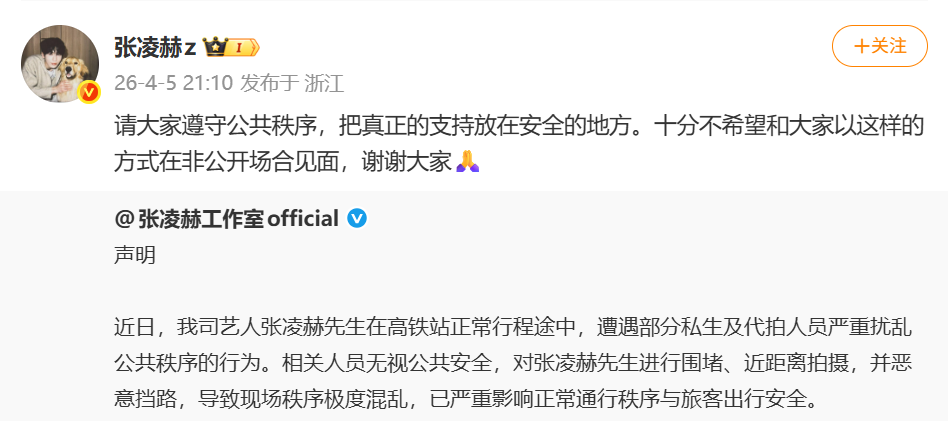 今晚(4月5日),@张凌赫工作室official 发声明,抵制私生及代拍行为: