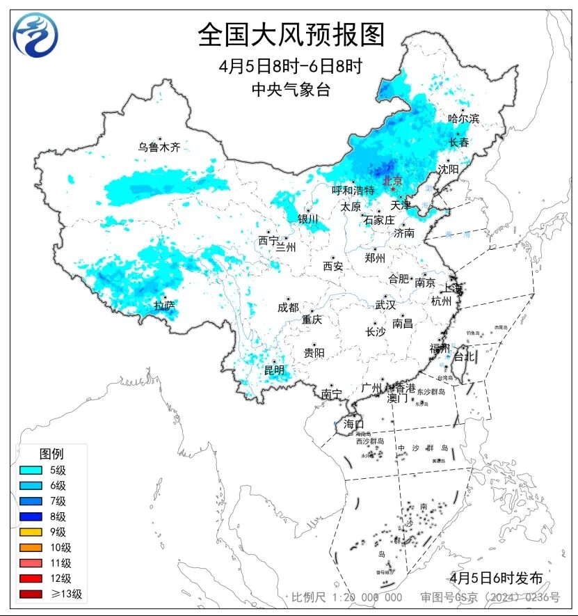 预计,4月5日08时至6日08时,内蒙古中东部、山西北部、京津冀北部和东部、吉林西部、辽宁西部、山东北部、新疆南部、甘肃西部、青海南部、西藏中部、川西高原北部、云南南部等地部分地区有5~7级风,阵风7~9级;其中,内蒙古中部局地阵风10级以上。