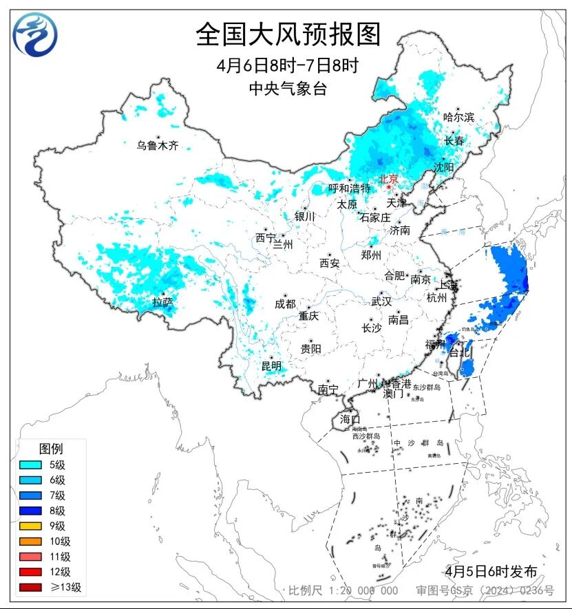 预计,4月6日08时至7日08时,内蒙古中东部、山西北部、河北北部、辽宁大部、吉林南部、新疆北部、甘肃西部、青海南部、西藏中部、川西高原、云南南部等地部分地区有5~7级风,阵风7~9级。台湾以东洋面、东海东部海域将有7~8级、阵风9级的大风。