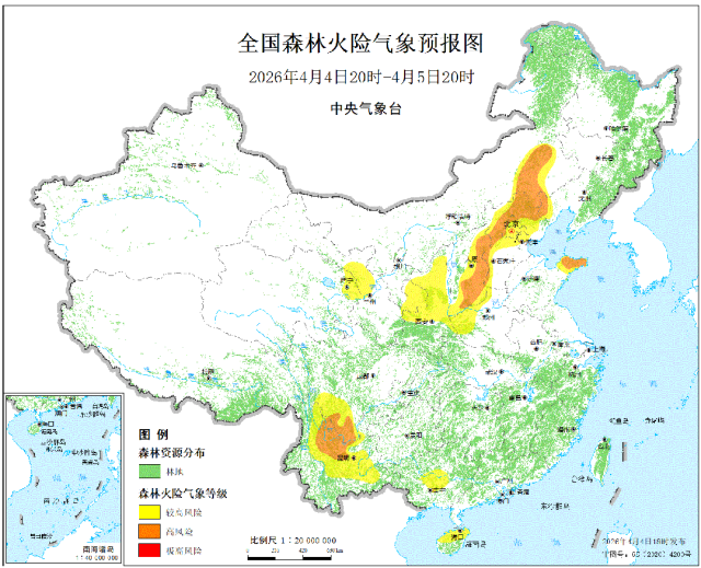 预计,4月4日晚上到5日白天,北京西部和北部、河北西部和北部、山西东部和南部、内蒙古东部、辽宁西部、山东东部、四川南部、云南中北部的局部地区森林火险等级为高度危险。内蒙古东部的局部地区草原火险等级为高度危险。