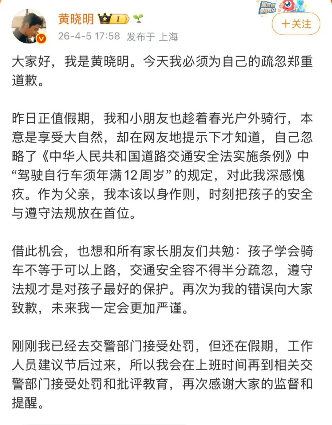 文中称,昨日正值假期,他和儿子趁着春光户外骑行,本意是享受大自然,却在网友的提示下才知道,他忽略了《中华人民共和国道路交通安全法实施条例》中“驾驶自行车须年满12周岁”的规定,对此他深感愧疚。作为父亲,他本该以身作则,时刻把孩子的安全与遵守法规放在首位。
