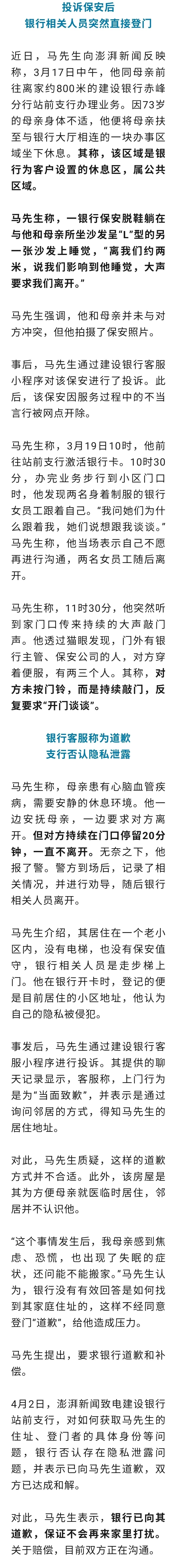 内蒙古自治区赤峰市市民马先生投诉银行保安不文明行为后,保安被开除。此后,中国建设银行赤峰分行站前支行相关人员穿便装,敲门要求“开门谈谈”。马先生称受到惊吓,认为其隐私遭泄露。