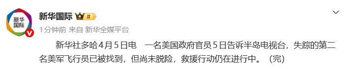 新华社多哈4月5日电一名美国政府官员5日告诉半岛电视台,失踪的第二名美军飞行员已被找到,但尚未脱险,救援行动仍在进行中。
