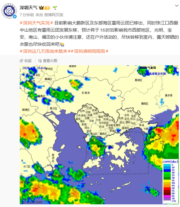 预计南山区、宝安区、光明区、珠江口和深圳湾2小时内将出现降水,深圳市气象台2026年04月05日16时16分将分区暴雨黄色预警信号扩展至上述区域,同时将雷电预警信号扩展至全市,预计2小时内全市将受雷电影响。全市处于暴雨戒备状态。市民停留在安全地方。上述区域存在山洪风险,请注意防御暴雨可能引发的局部内涝、山洪等灾害。