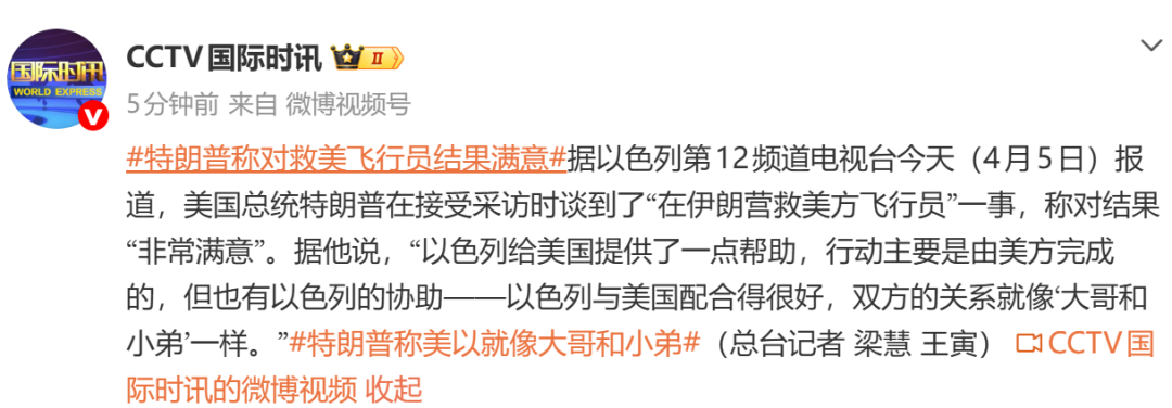 据以色列第12频道电视台今天(4月5日)报道,美国总统特朗普在接受采访时谈到了“在伊朗营救美方飞行员”一事,称对结果“非常满意”。据他说,“以色列给美国提供了一点帮助,行动主要是由美方完成的,但也有以色列的协助——以色列与美国配合得很好,双方的关系就像‘大哥和小弟’一样。”