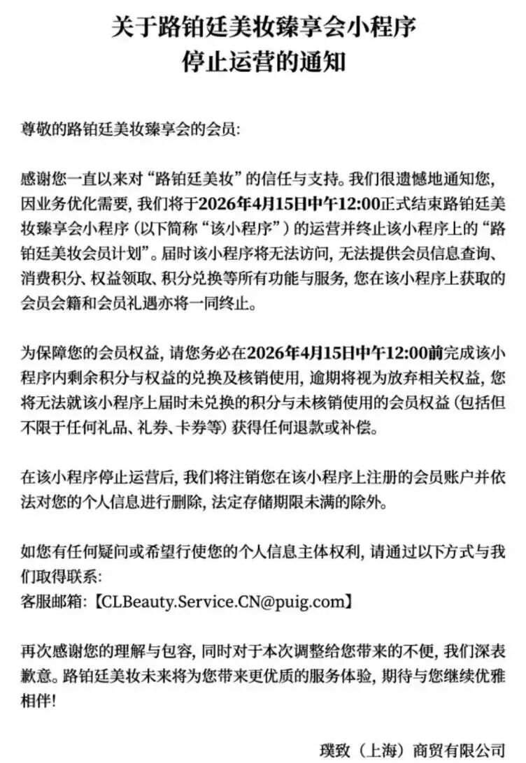 停止运营通知表示,将于2026年4月15日中午12:00正式停止小程序运营,同时将终止“路铂廷美妆会员计划”,所有会员相关的功能与服务、会员会籍及各类礼遇都将一并终止。通知特别提示,会员需在2026年4月15日中午12:00前,完成小程序内剩余积分与各项权益的兑换、核销使用,若逾期未操作,将视为自动放弃,无法获得任何退款或补偿。小程序正式停运后,会依法注销所有会员账户,并删除相关个人信息,提醒会员及时处理相关事宜。