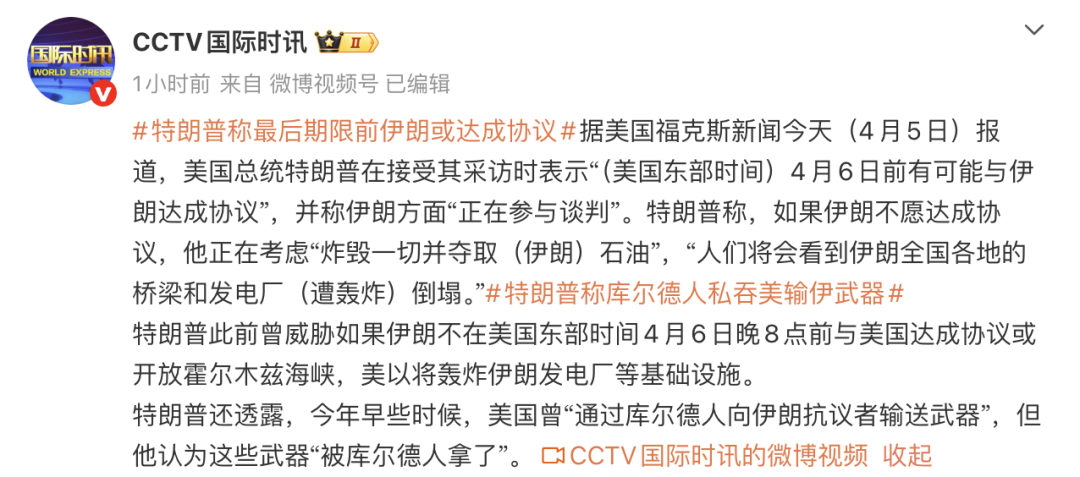 另据央视新闻援引美国福克斯新闻4月5日报道,美国总统特朗普在接受其采访时表示“(美国东部时间)4月6日前有可能与伊朗达成协议”,并称伊朗方面“正在参与谈判”。特朗普称,如果伊朗不愿达成协议,他正在考虑“炸毁一切并夺取(伊朗)石油”,“人们将会看到伊朗全国各地的桥梁和发电厂(遭轰炸)倒塌。”